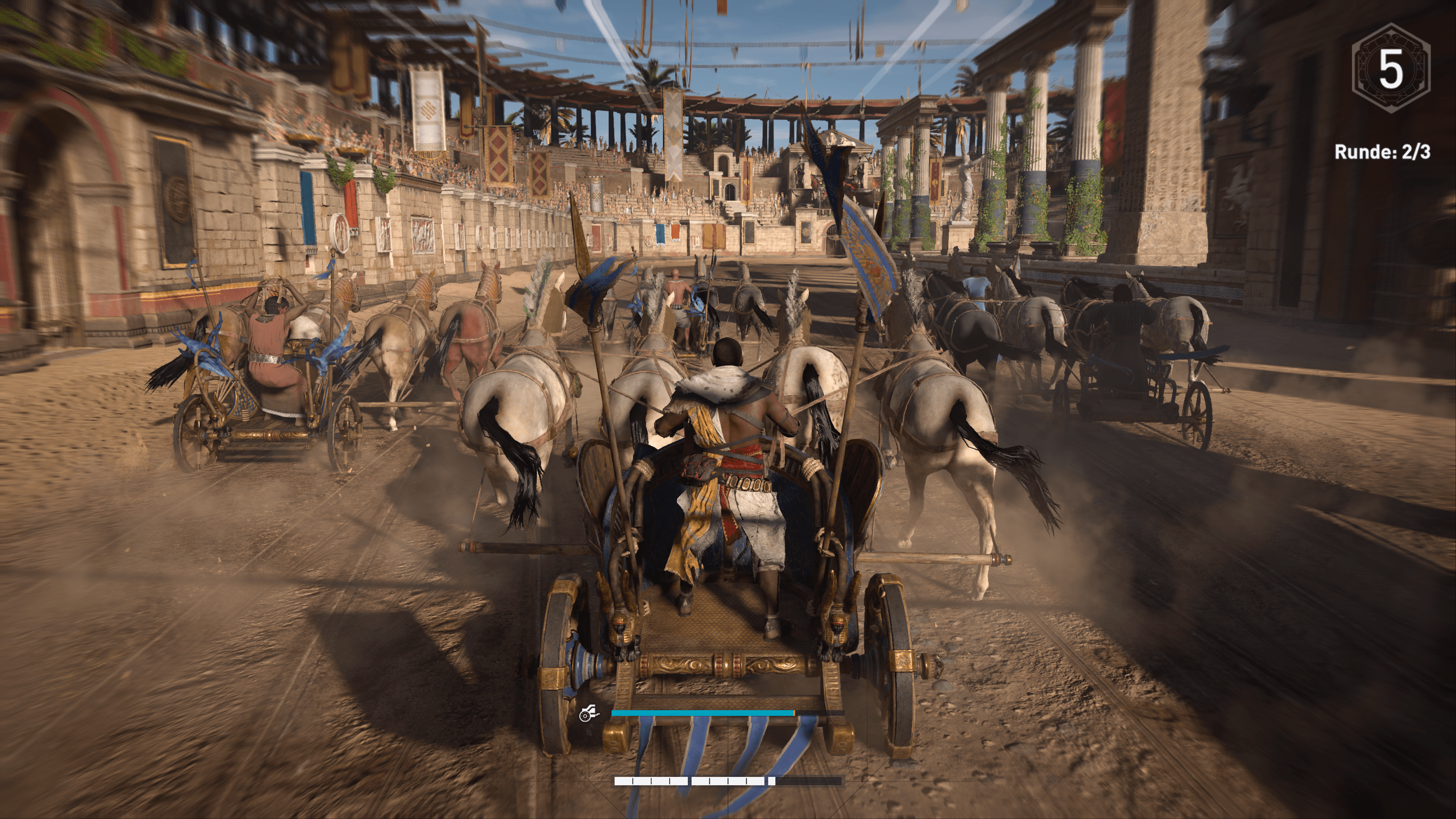 Mehr gestört haben mich da manche unscharfen Umgebungstexturen. Auf PS4 Pro und Xbox One X wird das Spiel mit dynamischer Auflösung mit mehr Pixeln berechnet, was sich in besonders scharfen Figurenmodellen bemerkbar macht. Manche Materialtexturen scheinen aber deutlich niedriger aufgelöst zu sein. Weiterhin ist mir aufgefallen, dass in großen Städten wie Alexandria die Framerate ein wenig in die Knie gehen kann. Das geschieht aufgrund der vielen Menschen und der aufwendig berechneten Wahrzeichen. Außerhalb der Riesen-Städte wirkt die Bildrate von 30 FPS jedoch sehr stabil. Daher ist dieser Aspekt abermals Meckern auf hohem Niveau. Aber er trägt dazu bei, dass ich der Optik nicht die volle Punktzahl geben kann.
