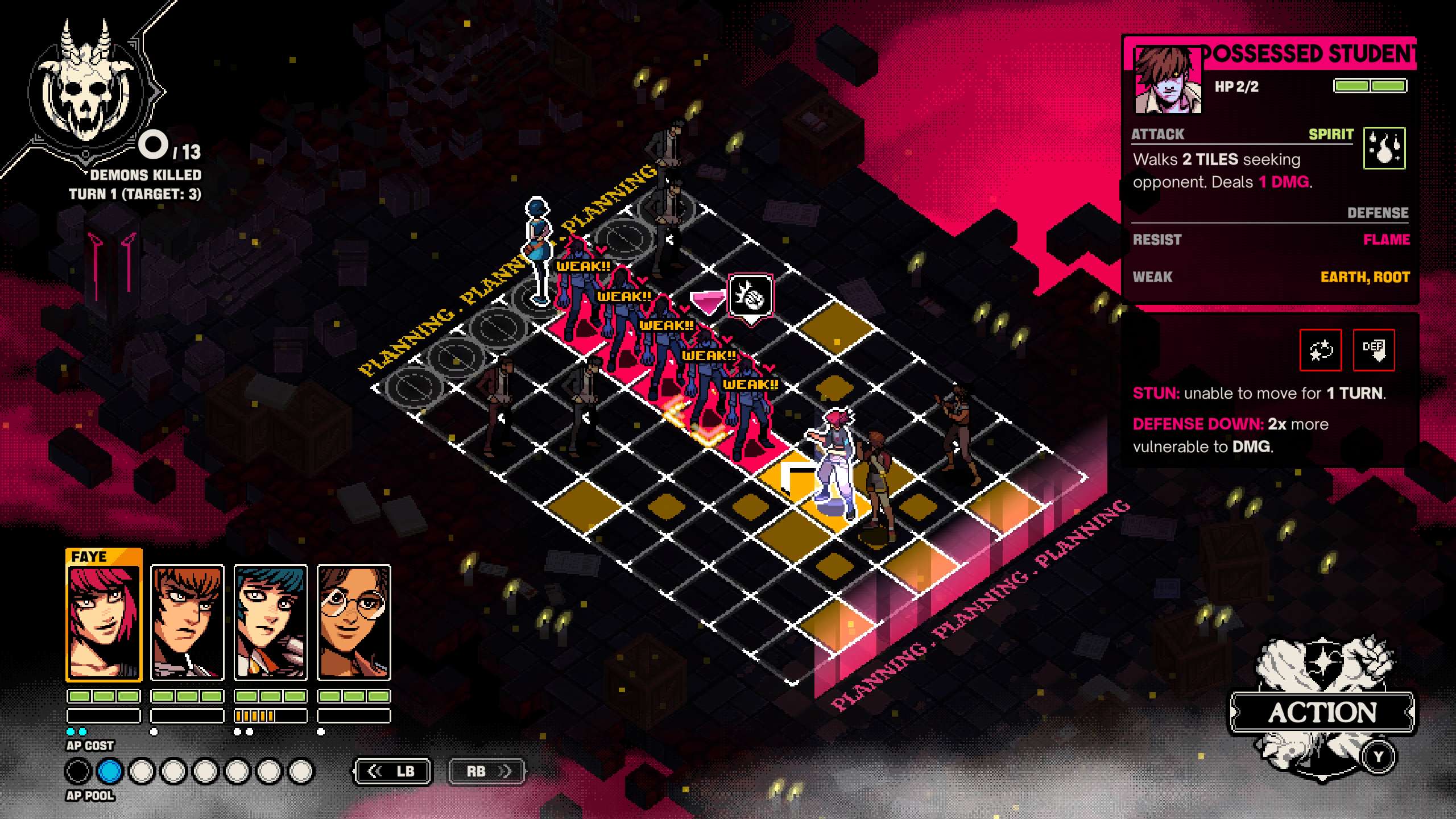 Treffen wir während Fayes Reise auf Dämonen, öffnet sich eine dämonische Arena im Schachbrett-Stil mit einer isometrischen Ansicht. Kämpfe laufen rundenbasiert ab, mit einer begrenzten Anzahl an Aktionspunkten pro Runde. Die erste Aktion jeder Figur verbraucht einen Aktionspunkt, die nächste zwei, und so weiter. Auf diese Weise wird ermutigt, alle Figuren in den Kampf einzubinden, da wiederholte Manöver mit ein und derselben Figur immer teurer werden. Eine Party von bis zu vier Figuren wird vor jedem Kampf zusammengestellt. Faye, Destin, Knute und Namako fungieren als Hauptcharaktere, mit denen Spielende die ersten Stunden verbringen. Später stehen jedoch insgesamt 15 Charaktere zur Verfügung, was eine taktische Vielfalt in der Gestaltung der Party ermöglicht. Ich hätte mir allerdings gewünscht, dass sich das Figurenaufgebot früher vergrößern würde. Es dauert mehrere Spielstunden, bis ausreichend weitere Gefährten dazustoßen, sodass eine spürbare Änderung in der taktischen Ausgangslage bemerkbar wird.