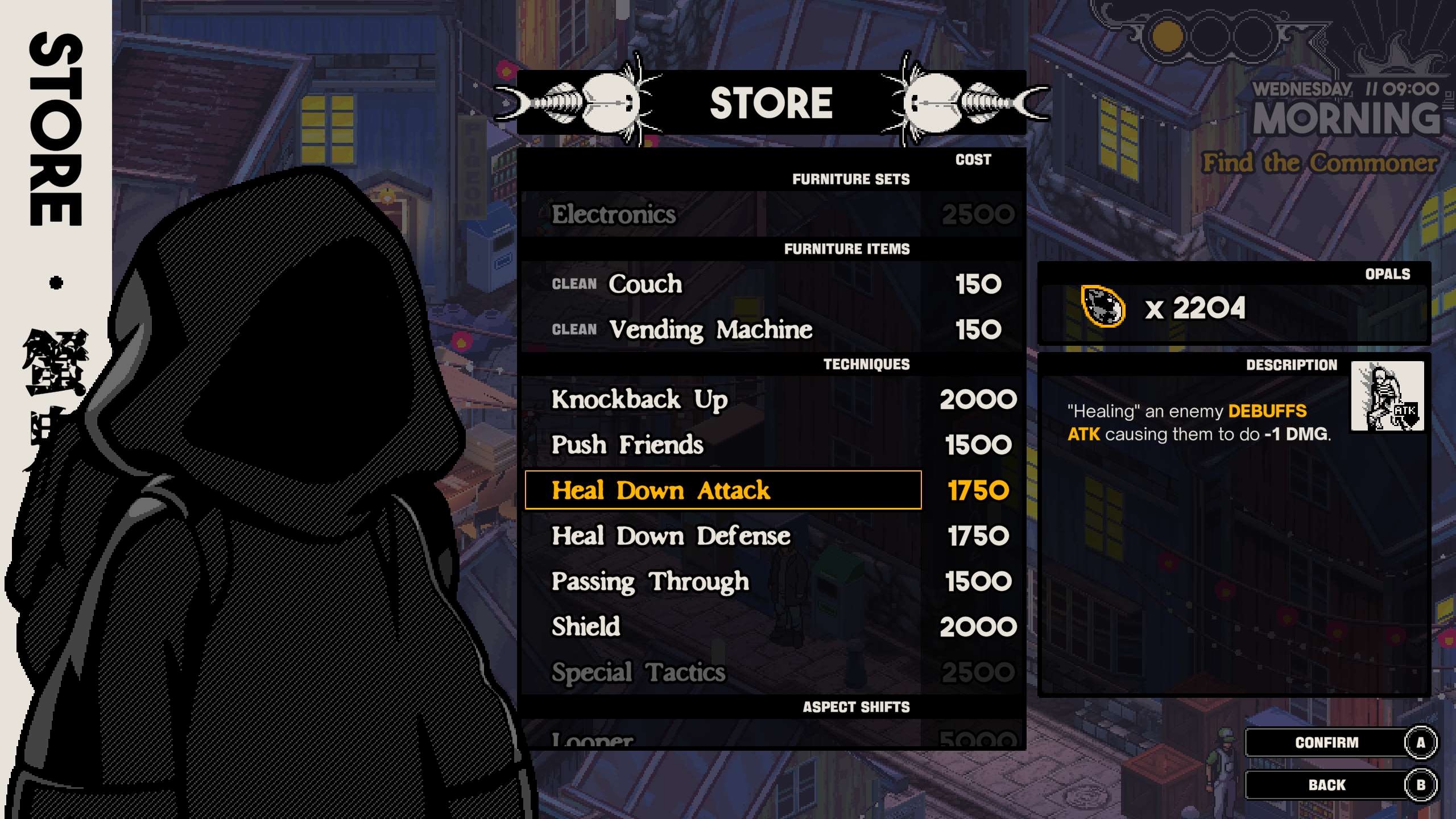 Statt klassischem Levelaufstieg setzt Demonschool auf das „Studieren“-Feature. Neue Fähigkeiten und passive Effekte werden über “Techniken” freigeschaltet, die wir im Spielverlauf erhalten. Ein Beispiel gefällig? Wer in einem Brunnen wiederholt “Opalsteine” stiehlt, wobei es sich um eine Währung im Spiel handelt, erhält nach einigen Tagen die Technik „Dieb“. Anschließend kann diese Technik “studiert” werden, was anschließend eine Fähigkeit freischaltet, mit der die ausgestattete Figur mehr Beute von feindlichen Dämonen erlangt. Das System ist nett gemacht, wirkt aber etwas zufällig und bietet keine klare Struktur. Techniken werden beiläufig freigeschaltet und so konnte ich nicht wirklich absehen, welche Aktionen welche Studier-Möglichkeiten freischalten würden. Immerhin lassen sich Techniken nicht nur beiläufig erlangen, sondern auch im Shop der Akademie im Tausch gegen Opal erwerben. Mit einer Fülle an passiven wie aktiven Fähigkeiten und mächtigen „Aspect Shift“-Techniken lädt Demonschool zum Experimentieren ein.