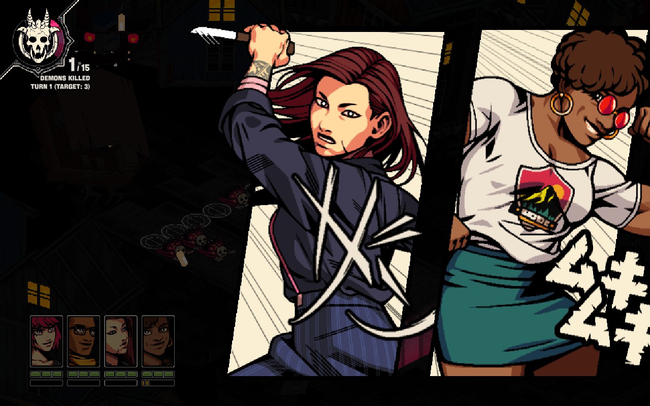 Optisch überzeugt Demonschool mit stilvollen, animierten Hintergründen sowie schicken Effekten bei Spezialangriffen und blutigen Attacken. Die Menüs sind schlicht und übersichtlich, stylische Übergänge beim Anbruch eines neuen Tages erinnern entfernt erneut an Persona. Ein wenig schade finde ich, dass manche NPCs generisch mit einer schwarzen Silhouette dargestellt werden und kein eigenes Design spendiert bekommen haben.