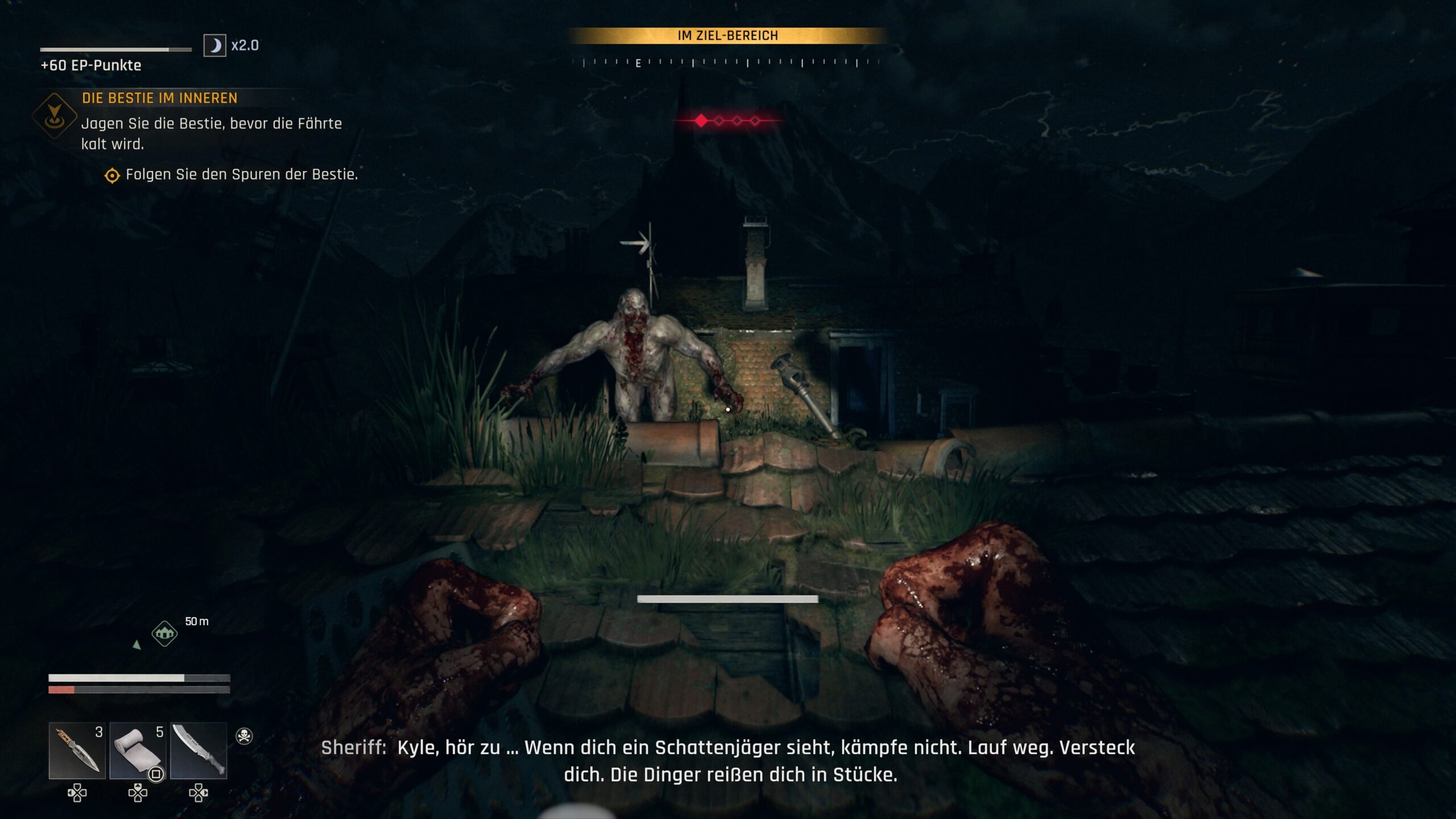 Dying Light: The Beast vereint wieder gekonnt das Parcour-Gameplay mit Waffengameplay, was man von der Reihe gewohnt ist. Das Parcour-Gameplay fühlt sich in diesem Teil nocheinmal flüssiger an und ihr kommt schnell von A nach B, vor allem sobald ihr den Enterhaken erhaltet. Auf der Seite der Waffen gibt es natürlich wieder Schuss- und Nahkampfwaffen, wobei letztere noch einmal zwischen stumpfen Hieb- und schneidigen Stichwaffen unterscheidet. Natürlich gibt es auch noch vielerlei Heil- und Nutzungsgegenstände, die ihr entweder irgendwo in der Welt findet oder teils selbst herstellen könnt. Während Nahkampfwaffen durch mehrmaliges Zuschlagen abgenutzt und nur eine bestimmte Anzahl an Reparaturen erhalten können, habt ihr mit Schusswaffen dieses Problem nicht, wobei hier natürlich die Munitionsknappheit eine Rolle spielt. Ihr könnt auch Mods herstellen, die ihr als Belohnung von Quests erhaltet oder in der Welt findet, mit welchen ihr die Waffen verstärken und mit etwaigen Statuselementen oder anderen Effekten ausstatten könnt. Durch das Absolvieren von Quests und Besiegen von Feinden erhaltet ihr Erfahrungspunkte, die zu einem Levelaufstieg führen und euch somit Skillpunkte bringen können. Damit könnt ihr eure Überlebensskills erlernen und erweitern, um so besser klettern, schleichen oder auch kämpfen zu können. Besiegt ihr eine der Chimären, so erhaltet ihr Bestienpunkte, die ihr nutzen könnt, um neuer Fähigkeiten für den Bestienmodus freizuschalten. Diesen könnt ihr aktivieren, wenn eine Anzeige durch Schaden oder Treffern durch euch aufgefüllt wird, wodurch ihr geheilt werdet und mit bloßen Händen alles um euch herum zerfetzt. Während es natürlich die klassischen Zombietypen wieder gibt, sind die Chimärenkämpfe sehr abwechslungsreich gestaltet. Mal kämpft ihr einfach gegen riesige Kreaturen, während andere klein und flink oder sogar unsichtbar sind. Seid ihr mal nicht in Kämpfe verwickelt, erkundet ihr das Tal und findet überall versteckte Gegenstände, Orte und natürlich auch vielerlei Eastereggs. Wenn ihr hier durch das Tal reist, kann es immer mal passieren, dass ihr auf den Hilferuf einer zufällig generierten Begegnung aufmerksam werdet, die sich aber auch gerne als Falle herausstellt. Während es tagsüber meist recht entspannt ist, ist die Nacht wieder mit viel mehr Hektik verbunden, denn da sind die Schattenjäger unterwegs, welche ihrem Namen gerecht werden und euch jagen. Entweder flieht ihr vor ihnen an einen der sicheren Orte oder ihr stellt euch ihnen, wobei euch harte Kämpfe erwarten. Zwar ist all dies viel hektischer, doch bringt es im Gegenzug mehr Erfahrungspunkte.