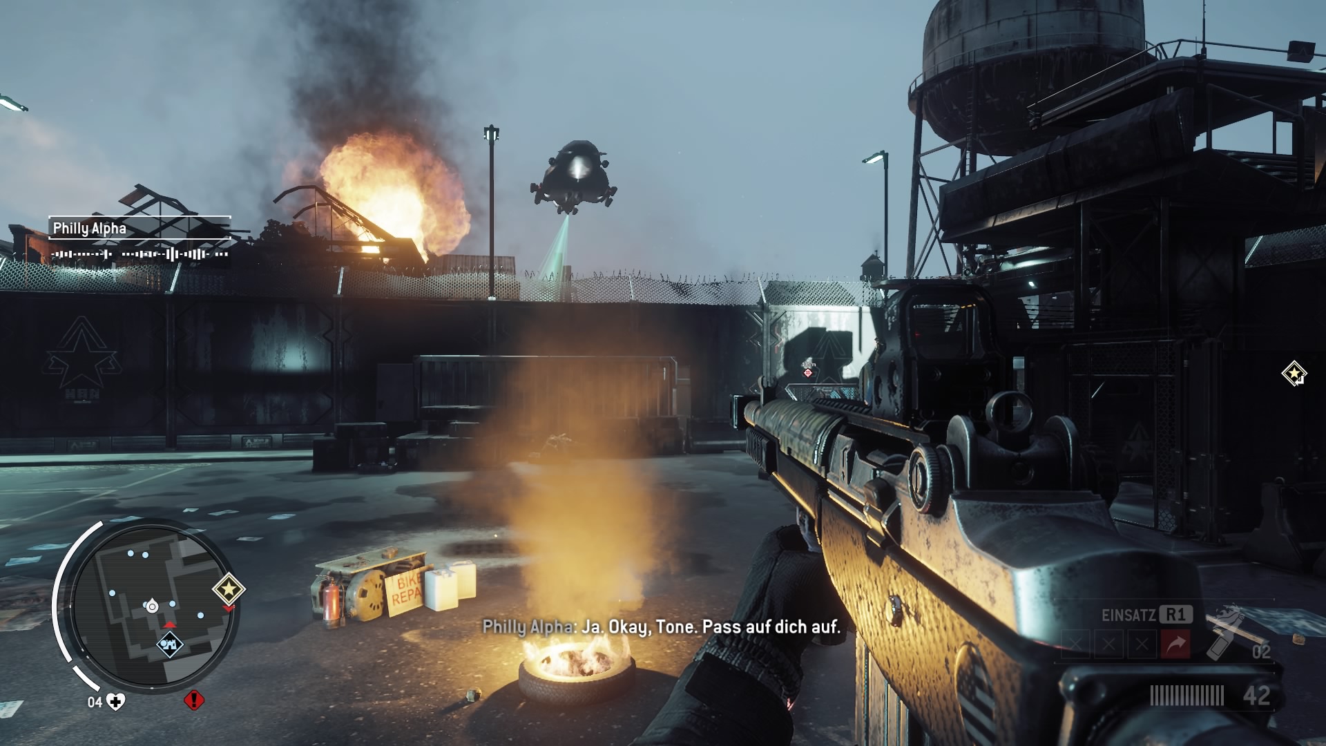 Und wie sieht es mit den spielerischen Aspekten aus? Fangen wir mit den Fakten an. Anders als das erste Homefront bringt The Revolution keine lineare Spielwelt daher, sondern bietet eine quasi-offene Welt an. Völlig frei können Spieler allerdings auch nicht in den Umgebungen umherlaufen, sodass der Begriff „offene Welt“ nur bedingt zutrifft. Das virtuelle Philadelphia ist in acht Bezirke aufgeteilt, in denen wir wiederum frei auf Erkundungstour gehen können. Die Gebiete werden wiederum in rote und gelbe Zonen aufgeteilt, die Gefechtsgebiet und kriegsfreie Undercover-Areale darstellen. Wollen wir eine Zone wechseln, hindert uns ein langer Ladebildschirm zunächst daran. Die Hauptmissionen von Homefront: The Revolution erfordern zumeist vom Spieler, zu einem bestimmten Ort zu laufen, unterwegs mehrere Gegnergrüppchen über den Haufen zu schießen und am Zielort etwas zu aktivieren oder aufzusammeln. Dieses öde Konzept wird allerdings durch gelegentliche Stealth-Sequenzen aufgefrischt. Da die Widerstandstruppen aus dem Hinterhalt aus angreifen, ist ein vorsichtiges und heimliches Vorgehen des Öfteren gefragt. Neben mächtigen Bodentruppen müssen wir außerdem auf der Lauer sein vor Drohnen, die nach uns fanden. Eine Munitionsverknappung macht die Anspannung komplett, die gelegentlich in wirklich spaßigen Momenten endet. Die semi-offene Welt kommt hier zum Vorteil und überlässt uns hin und wieder die Freiheit über das Vorgehen. Neben Munition spielen zudem auch diverse Resourcenarten eine größere Rolle, die in den zerstörten Straßen und Häusern versteckt sind. Dazu gesellen sich Tagebücher als Sammelobjekte. Auf diese Weise werden wir dazu ermutigt, die Areale zu erkunden, was wir aus den meisten Open-World-Titeln bereits kennen. Ebenfalls vertraut dürften viele Spieler mit den Nebenmissionen sein, die stark an die Far Cry-Reihe erinnern. Neben der klassischen „Wachposten“, die bei Eroberung ein Stück der Karte preisgeben, sind unter anderem auch Stützpunkte dabei, die es optional von KPA-Feinden zu befreien gilt. Da ich diese Tätigkeiten schon zuhauf in anderen Spielen erleben dürfte, dauerte es hier nicht lang, bis ich mich beim Erobern und Einnehmen langweilte. Die meisten Jobs der NPCs, um diese zum Widerstand anzustacheln, laufen strukturell zudem auch letztendlich aufs Selbe hinaus, wodurch ich abseits der Story nicht gerade zum Spielen motiviert wurde. Dass wir in den Handlungsaufgaben bereits ausreichend Geld bekommen, um uns die meiste Ausrüstung kaufen zu können, spielt den nebensächlichen Missionen ebenfalls nicht in die Karten. Die meisten Waffen präsentieren sich unspektakulär und verpassen es, das Zukunftssetting kreativ auszunutzen. Mit einem ferngesteuerten Explosions-Vehikel und einer Art Hacking-Terminal, das feindliche Technologie zu unserem Freund und Helfer macht, sind allerdings auch zwei gelungene Konzepte enthalten. Der neue Homefront-Titel kommt mit einem Upgrade- und Crafting-System daher, das gegen etwas Kleingeld vorhandene Waffen „on-the-fly“ optimieren und gar umwandeln kann. Es sind wirklich abwegige Umwandlungen möglich, die sich aber durchaus lohnen – es warten mächtige Waffen auf. Weiterhin präsentiert The Revolution ein nützliches Motorrad, das in so mancher Situation zum schnellen Rückzug hilfreich sein kann. An die schwammige Steuerung musste ich mich zunächst jedoch gewöhnen und auch finde ich es schade, dass wir auf dem Bike keine Waffe nutzen können – dafür müssen wir wieder absteigen. Dennoch ist das Motorrad allein dafür schon eine tolle Implementierung, um schnell von A nach B zu kommen. Insgesamt macht Homefront: The Revolution so einige Aspekte richtig, doch hat mich das Geschehen nur selten überzeugen können. Aufgaben, Tätigkeiten und auch das Crafting-System sind aus ähnlichen Spielen bekannt und von seinen Genre-Kollegen schlichtweg schon besser in Szene gesetzt worden. Der Großteil der Mechaniken ist durchaus solide ausgefallen, doch sprang bei mir nie der Funke über.