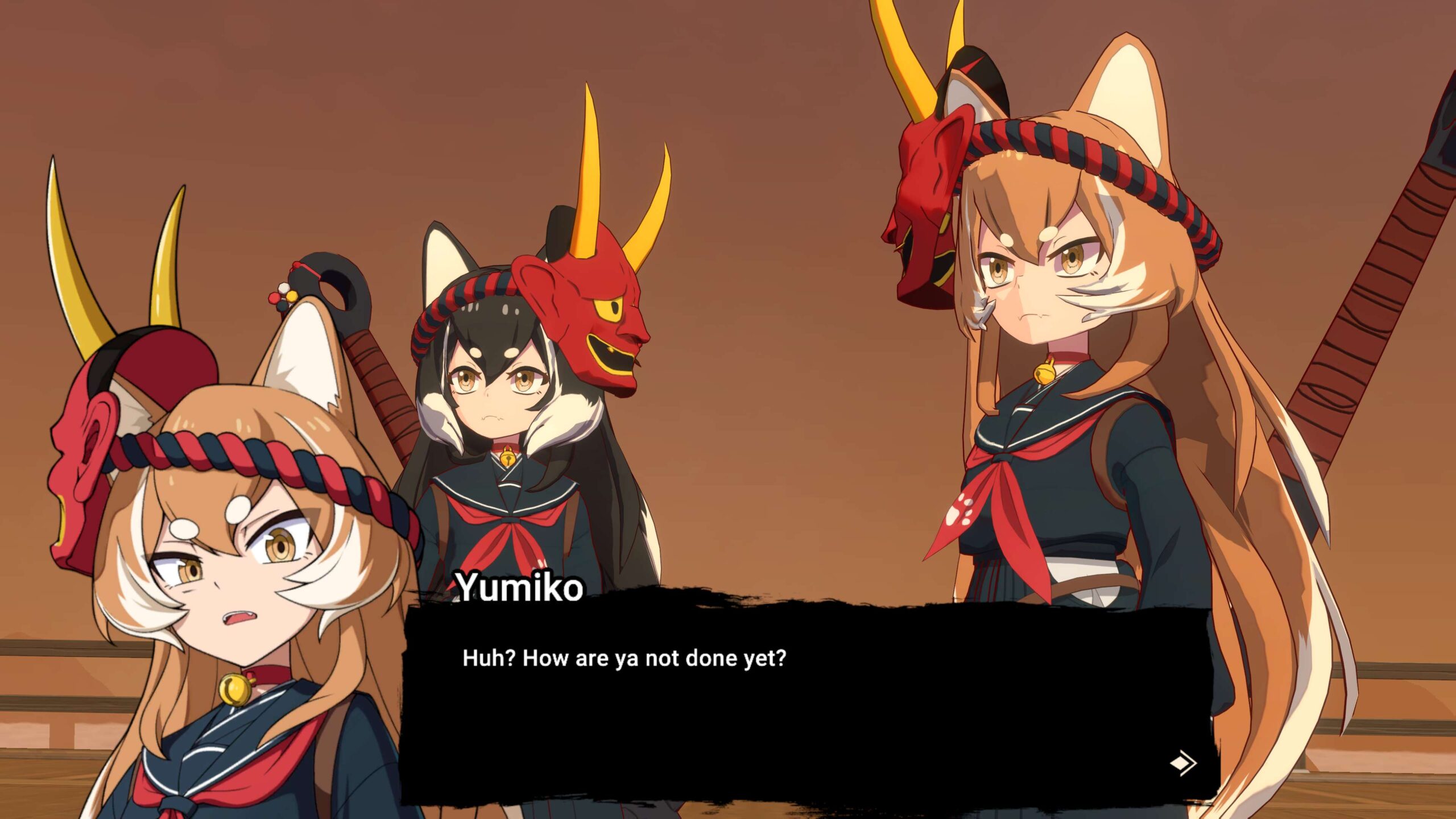 Für ein Projekt, das vermutlich ein eher niedriges Budget hatte, bietet Homura Hime eine ansprechende Optik mit knalligen Farben und einem passenden Anime-Look. Technische High-End-Features wie Raytracing fehlen, doch wirklich vermisst habe ich diesen technischen Schnickschnack nicht. Lediglich an den eher kargen Umgebungen lässt sich erkennen, dass grafisch noch mehr drin gewesen wäre. Insgesamt sieht das Spiel sehr ordentlich aus. Weniger gelungen fand ich die Benutzeroberfläche und die verwendeten Schriftarten, die zwar übersichtlich und gut leserlich gestaltet sind, auf mich persönlich aber einfach etwas billig wirken. Zudem sehen die Texte und Figurenartworks während der Storysequenzen im Visual Novel-Stil zumindest auf einem 4K-TV verschwommen aus, was im Kontrast zu den sonst scharfen 3D-Figurenmodellen steht. Auch hätte ich mich über detaillierte Grafikeinstellungen gefreut. Die Optionen sind sehr überschaubar. Ebenfalls habe ich einen Ultrawide-Support vermisst, der glücklicherweise aber durch eifrige Modder bereits möglich gemacht wurde.