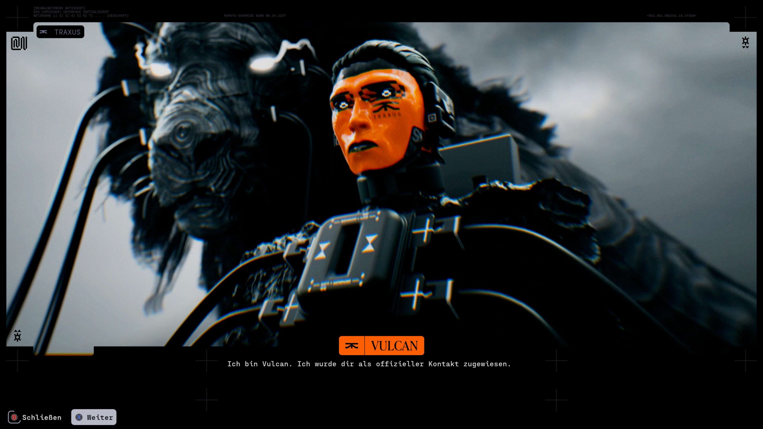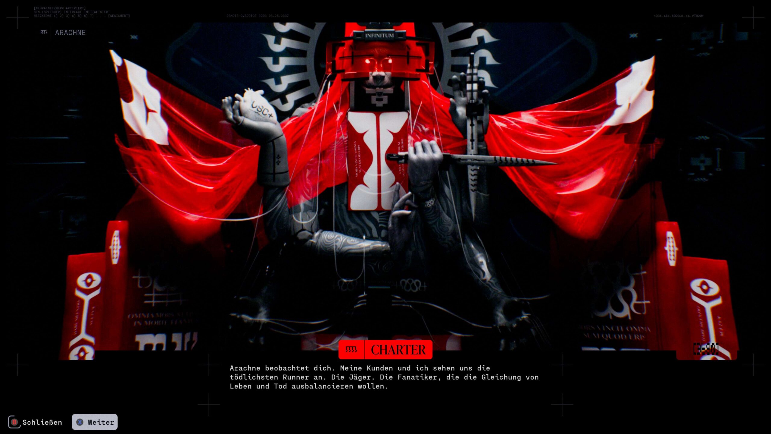 Daraufhin entsenden verschiedene Fraktionen sowie Mega-Konzerne, die in das Projekt investiert haben, sogenannte „Runners“. Dabei handelt es sich um Menschen, die ihren Körper zugunsten hochspezialisierter Kybernetik-„Hüllen“ aufgegeben haben. Diese Runners sollen in die Kolonie eindringen, gegen UESC-Truppen, rivalisierende Runners und außerirdische Kräfte kämpfen und wertvolle Artefakte, Daten und Ressourcen bergen. Die Geschichte bringt viele interessante Themen ein und es ist spannend zu verfolgen, was mit der Kolonie passiert ist. Ich habe mich allerdings ein wenig daran gestört, dass man die Story selbst nicht wirklich erlebt. Stattdessen werden die Geschehnisse hauptsächlich in Menüs vorangetrieben, allen voran durch gruselige Fraktionsführer, die in kryptischen Botschaften zu uns sprechen. Dadurch fasste ich die Handlung eher als atmosphärische Randnotiz auf, die einen Rahmen für den Besuch von Tau Ceti IV schafft. Wer im Gegensatz zu mir stärker in den Bann der Geschichte gezogen wird, kann mit Hilfe unzähliger Kodexeinträge tiefer in das Lore des Marathon-Universums eintauchen.