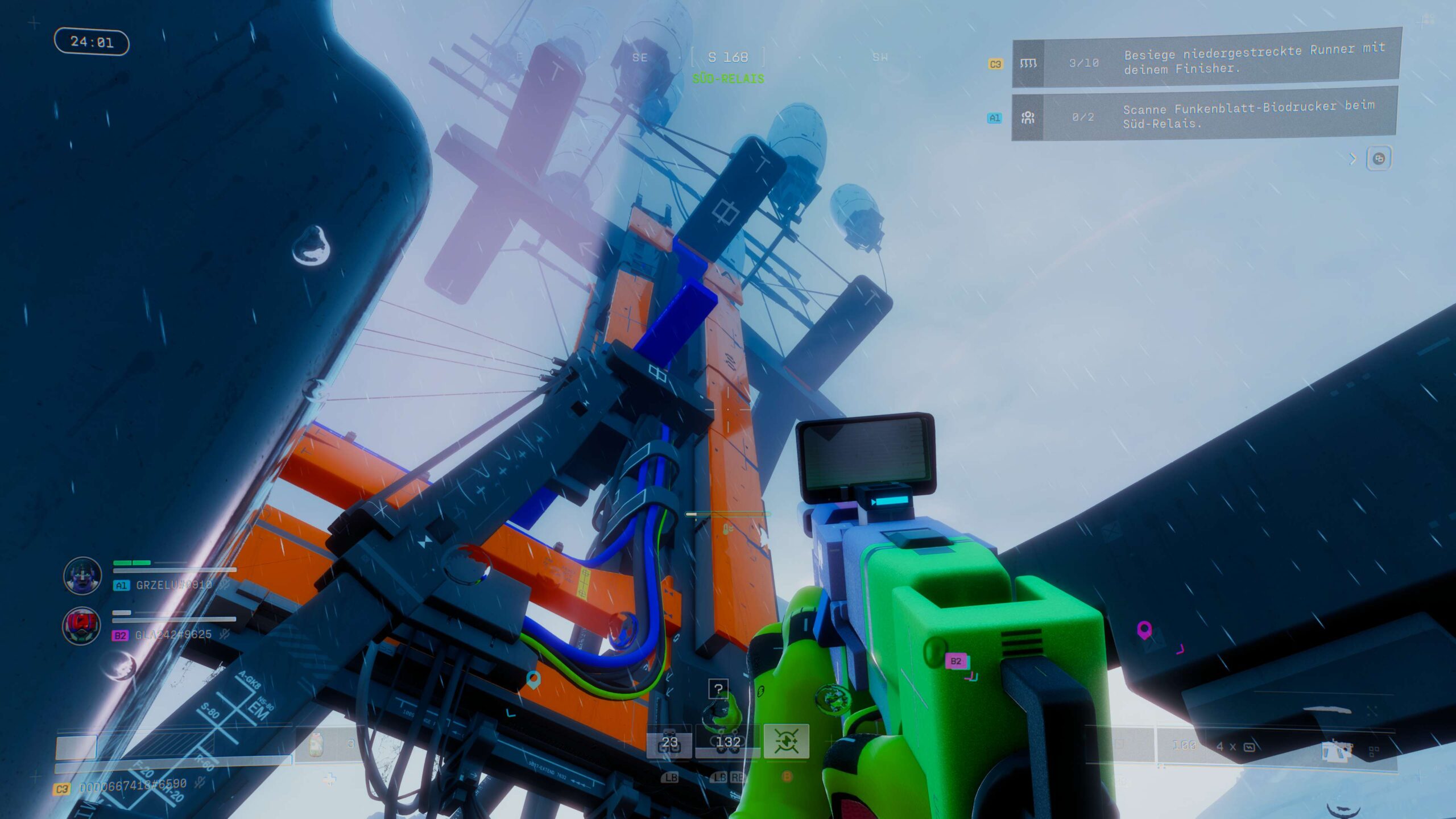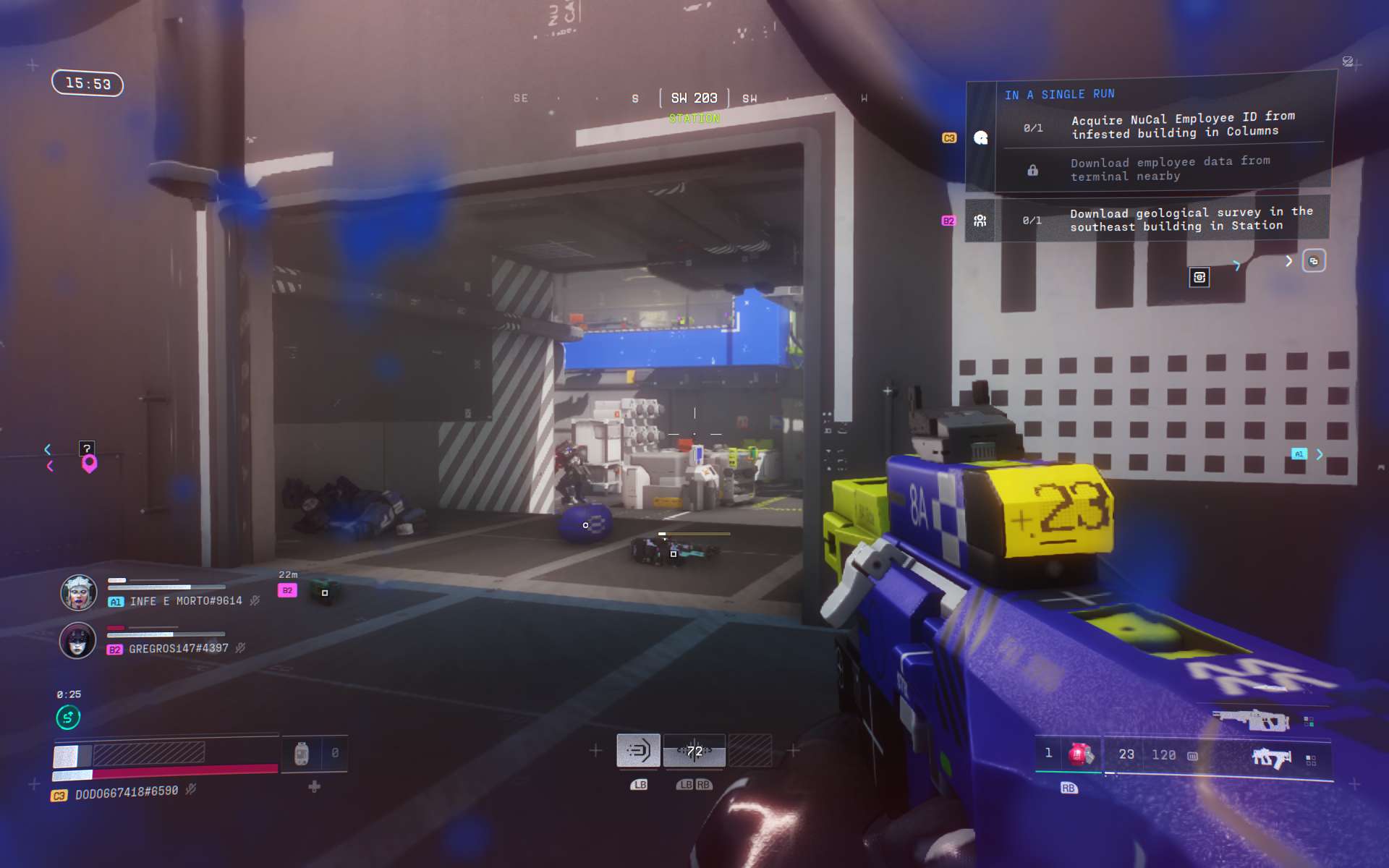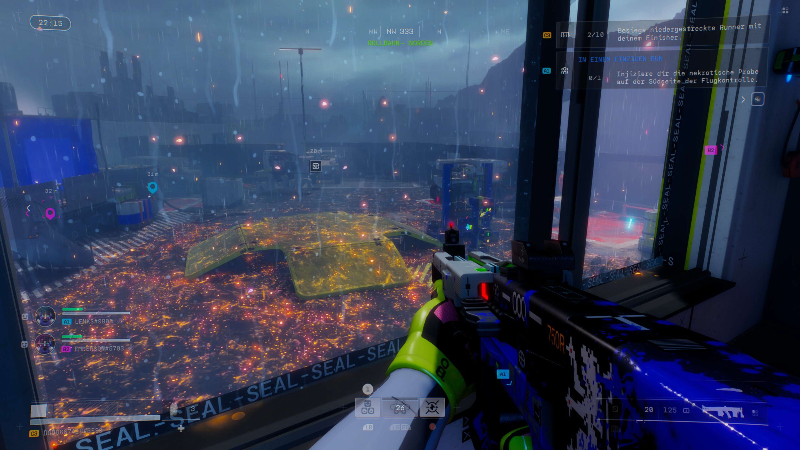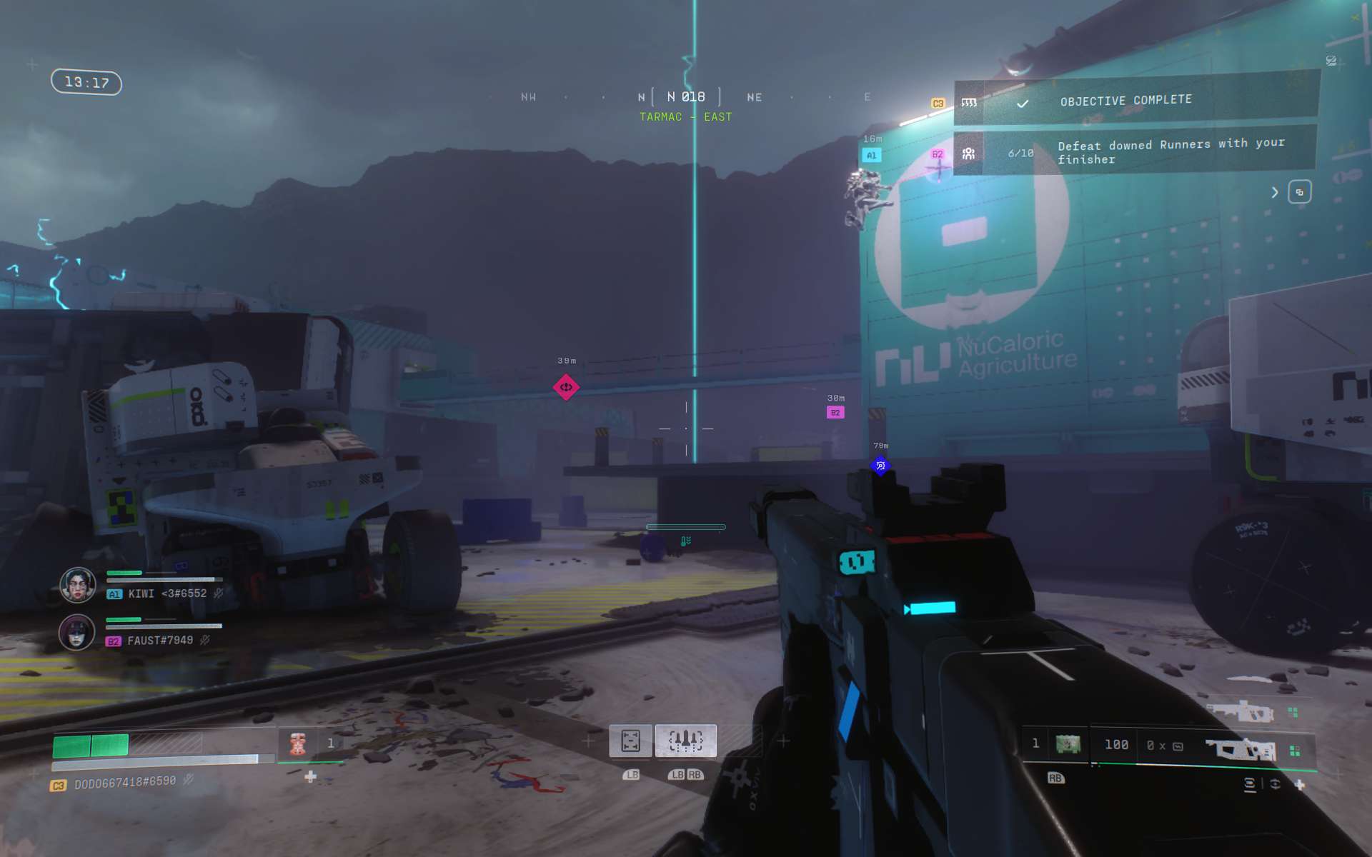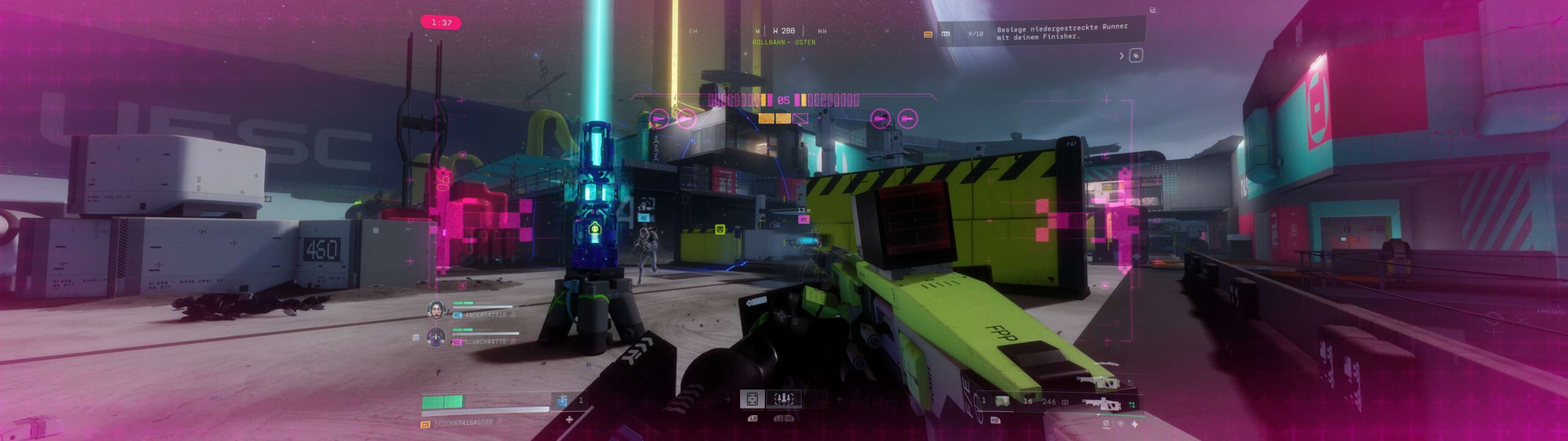 Selbst wenn man in einer Runde das Zeitliche segnet, sorgt Marathon in den meisten Fällen dennoch für Fortschritt. Viele der Missionen sind darauf ausgelegt, über mehrere Runs hinweg bestimmte Aufgaben zu erledigen: Töte X Runner, erledige X UESC-NPC-Einheiten, zerstöre X Nester von spinnenähnlichen Wesen. Nach fast jeder Runde gibt es XP für den übergreifenden Saisonrang sowie für die einzelnen Ränge der Fraktionen. Mit steigender Spielzeit werden allerdings auch mehrere Aufträge freigeschaltet, die aufeinander aufbauende Teilaufgaben in ein und derselben Runde vorgeben. Häufig sind die Terminals, die wir dabei betätigen müssen, aber nicht direkt nebeneinander platziert, sondern an unterschiedlichen Enden der Karte aufgestellt. Das führt dazu, dass die Erfüllung der Folgeaufgaben ohne zu sterben zur knackigen Herausforderung wird.