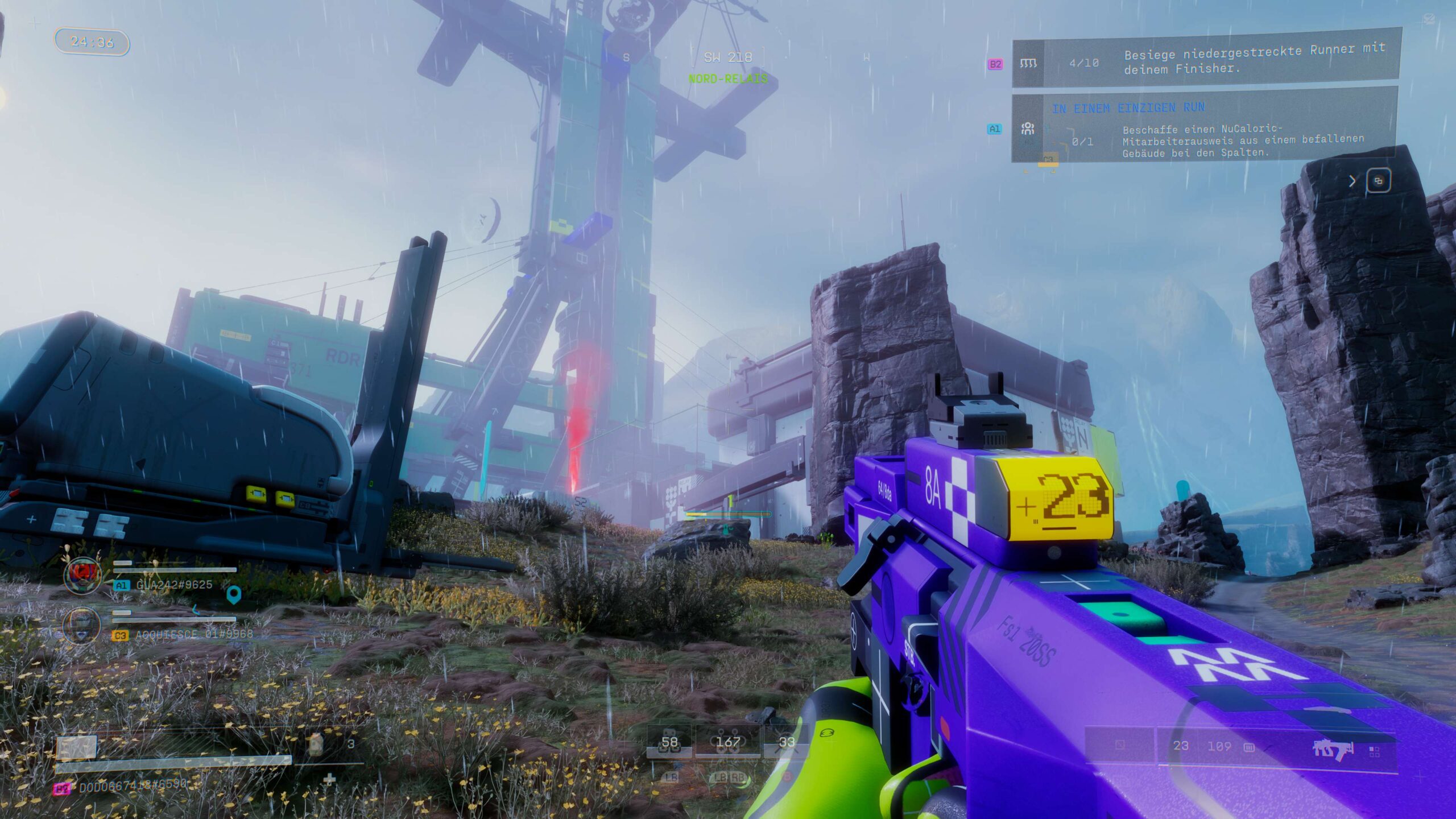 Marathon vermittelt von Beginn an ein deutliches Hardcore-Spielgefühl. „Shoot on sight“ beschreibt das Erlebnis wohl am treffendsten, denn freundliche Begegnungen mit fremden Spielern sind selten. Dadurch entsteht ein völlig anderes Spielgefühl als beispielsweise in Arc Raiders, das sich durch eine soziale Komponente mit deutlich mehr Zusammenarbeit auszeichnet. Marathon betont stattdessen den PvP-Charakter der Gefechte. Genau das gefällt mir persönlich sehr gut. Trotzdem ist der Schwierigkeitsgrad hoch. Die KI-Feinde teilen nicht nur enorm viel Schaden aus, sondern treten gerne auch in Scharen auf. Manche Aufgaben sind zudem kryptisch formuliert und die Beschreibungen helfen nur bedingt weiter. Hinzu kommt die anfängliche Angst, die eigene Ausrüstung zu verlieren, was den Einstieg zusätzlich erschwert.