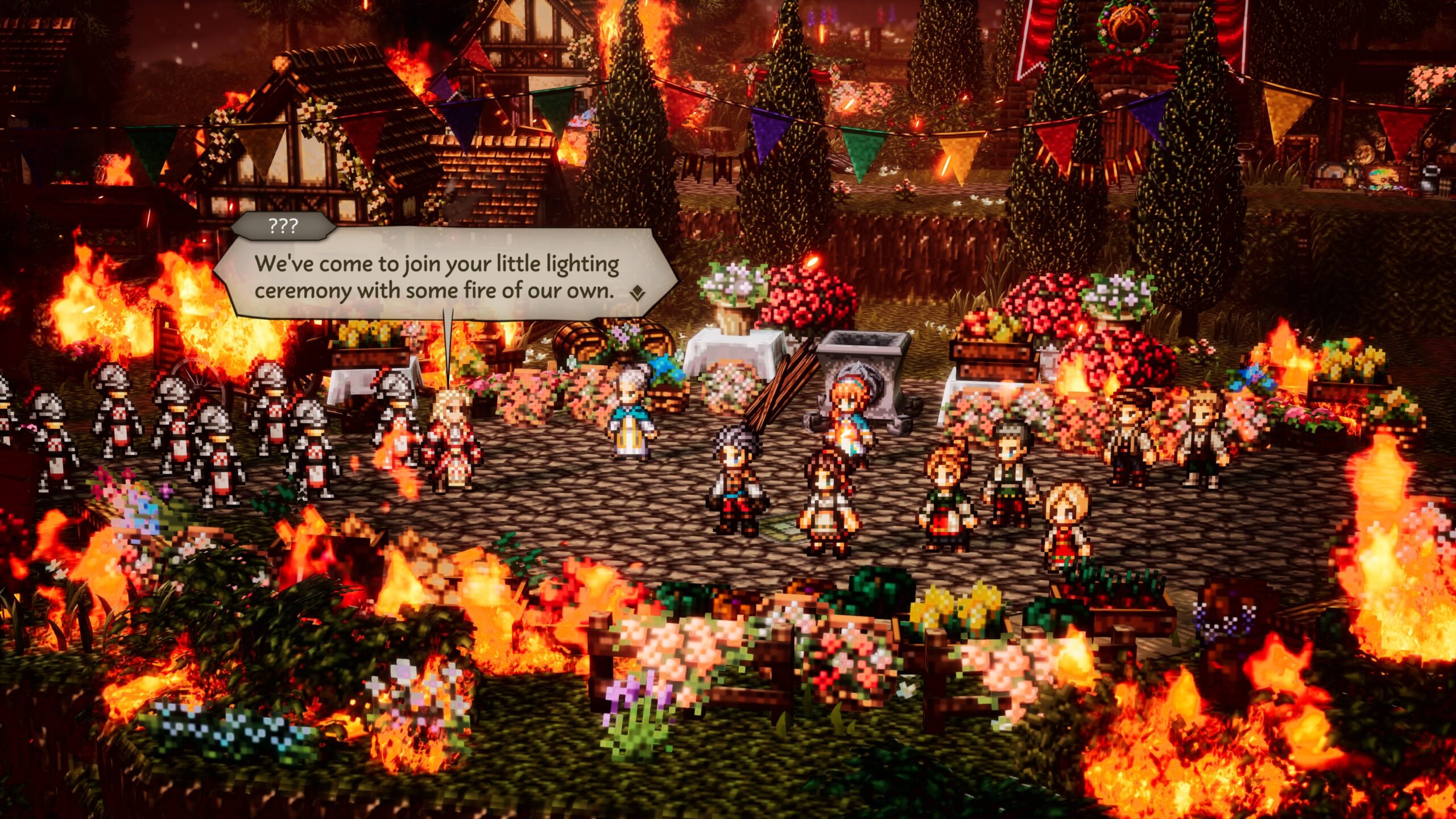 Ihr startet mit eurem Protagonisten euer Abenteuer in Wishvale einem kleinem Dorf im Reich von Orsterra. Dieses wird zerstört und fast jeder umgebracht. Euer Ziel in Octopath Traveler 0 ist neben der verständlichen Rache an denen, die diese Zerstörung verursacht haben auch wieder Hoffnung im Wiederaufbau von Wishvale zu finden. Dafür erhaltet ihr einen Ring, der euch die Macht verleihen soll, dass zu erlangen, was ihr am meisten begehrt. Zu Beginn ist euer Ziel 3 Schurken aufzuspüren, die das ganze Chaos verursacht haben. Dabei könnt ihr die Geschichten in selbst ausgesuchter Reihenfolge erleben und auch nach Belieben zwischen diesen hin und her wechseln. Dabei lernt ihr auch immer wieder neue Charaktere kennen, die euch auf eurer Reise begleiten oder beim Aufbau von Wishvale unterstützen können. Diese haben oft ihre ganz eigenen Geschichten. Die Story ist dabei sehr gut erzählt und bringt immer wieder interessante Wendungen mit sich, so dass auch sehr politisch angelehnte Gespräche nie langweilig werden.