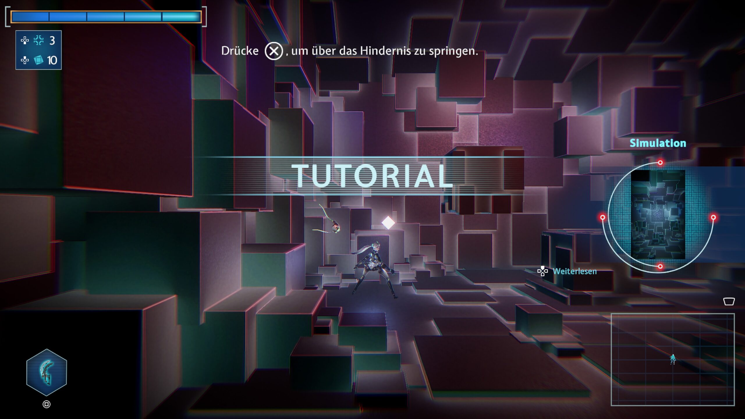 ReSetna mag mit seinen schlaurigen Leveln und unterschiedlichen Zonen, die man immer mal wieder erneut mit neuen Skills bereisen kann, auf den ersten Blick, wie ein Metroidvania wirken, doch ist zumindest der Erkundungsfaktor meist eher uninteressant. Erwartet ihr am Ende eines meist zuerst nicht zugänglichen Ganges einen Schatz oder ähnliches, werdet ihr in diesem Spiel oftmals enttäuscht. Was dafür definitiv nicht enttäuschend ist, ist das Kampfsystem. Dieses spielt sich extrem flüssig und flott und weißt damit in seinen Bann zu ziehen. Normale Gegner sind dabei für gewöhnlich kein Problem und werden erst in der Masse gefährlich. Ein besonderes Highlight sind dann aber die Bosse, die jeweils am Ende der 7 Zonen warten und euch vor eine größere Herausforderung stellen. Diese sind dabei sehr abwechslungsreich. Wie schon erwähnt schaltet ihr nach und nach neue Bewegungsskills frei, wie einen Enterhaken oder den Doppelsprung. Besiegt ihr Gegner, erhaltet ihr Währung und Craftingmaterialien, wobei letzteres von den Zonen abhängig ist, wodurch ein wenig Abwechslung ins Spiel kommt. Mit diesen beiden Sachen, könnt ihr Upgrades für Lebensverbesserungen und ähnliches kaufen oder eine neue Waffe, wobei diese in 3 Waffenarten unterteilt werden: Doppelaxt, Speer und Schwert. Diese spielen sich angenehm unterschiedlich.