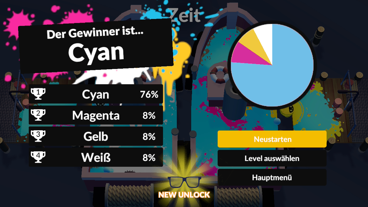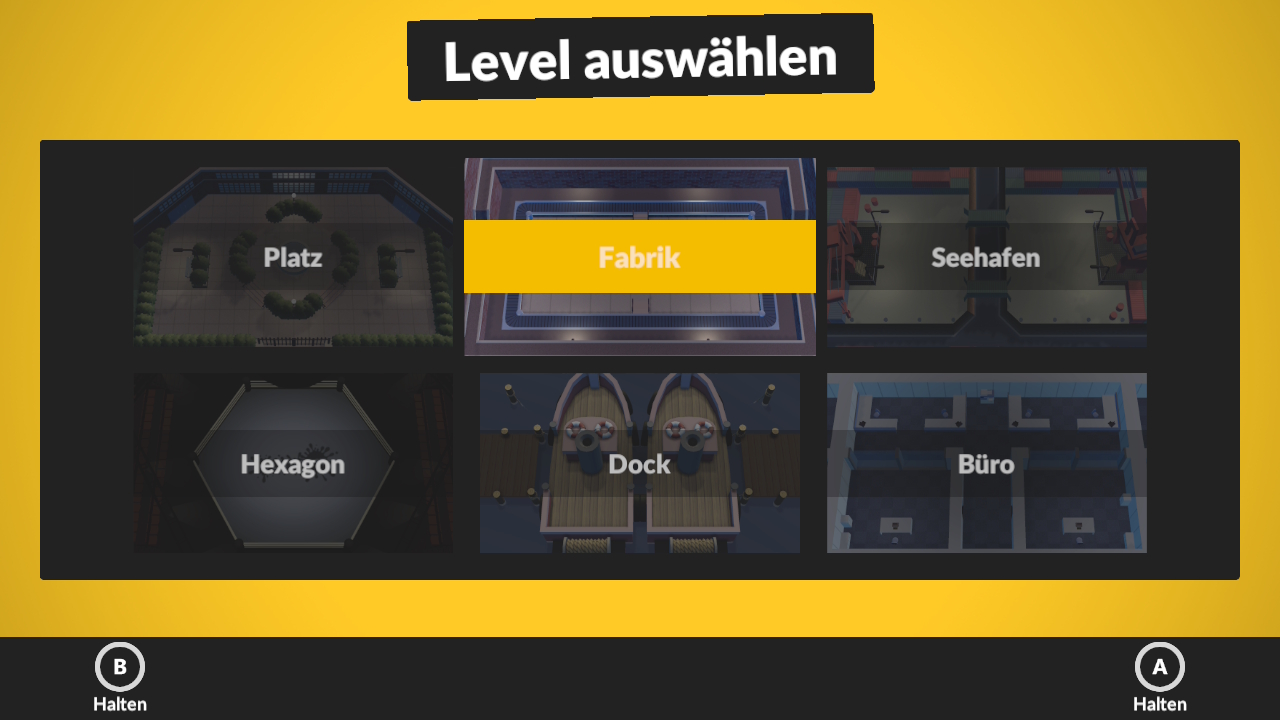Splatterbot besitzt keinen Storymodus aber verschiedene Modi, in denen ihr das Spiel erleben könnt. So könnt ihr entweder jeder gegen oder in zweier Teams spielen. Ziel ist es mehr Fläche in eurer Farbe einzufärben. Dabei fahrt habt ihr aus der Vogelperspektive einen Überblick über das Spielfeld. Euer Roboter verteilt die Farbe einfach, wenn er fährt. Es tauchen auch immer wieder Items auf, die ihr einsammeln könnt, um zum Beispiel schneller zu werden, einen größeren Radius einzufärben oder eine einmalige Farbbombe zu werfen. Ihr könnt das Ganze entweder gegen KI-Gegner spielen, die leider nicht die klügsten sind und sich immer mal festfahren, oder mit bis zu 4 Personen an einer Konsole, wobei letzteres vor allem Spaß macht. Es gibt noch unterschiedliche Stages, aus denen ihr wählen könnt. Ihr könnt auch in den Einstellungen einzelne Items abschalten oder die Rundenzeit zwischen 1, 2 oder 3 Minuten wählen.