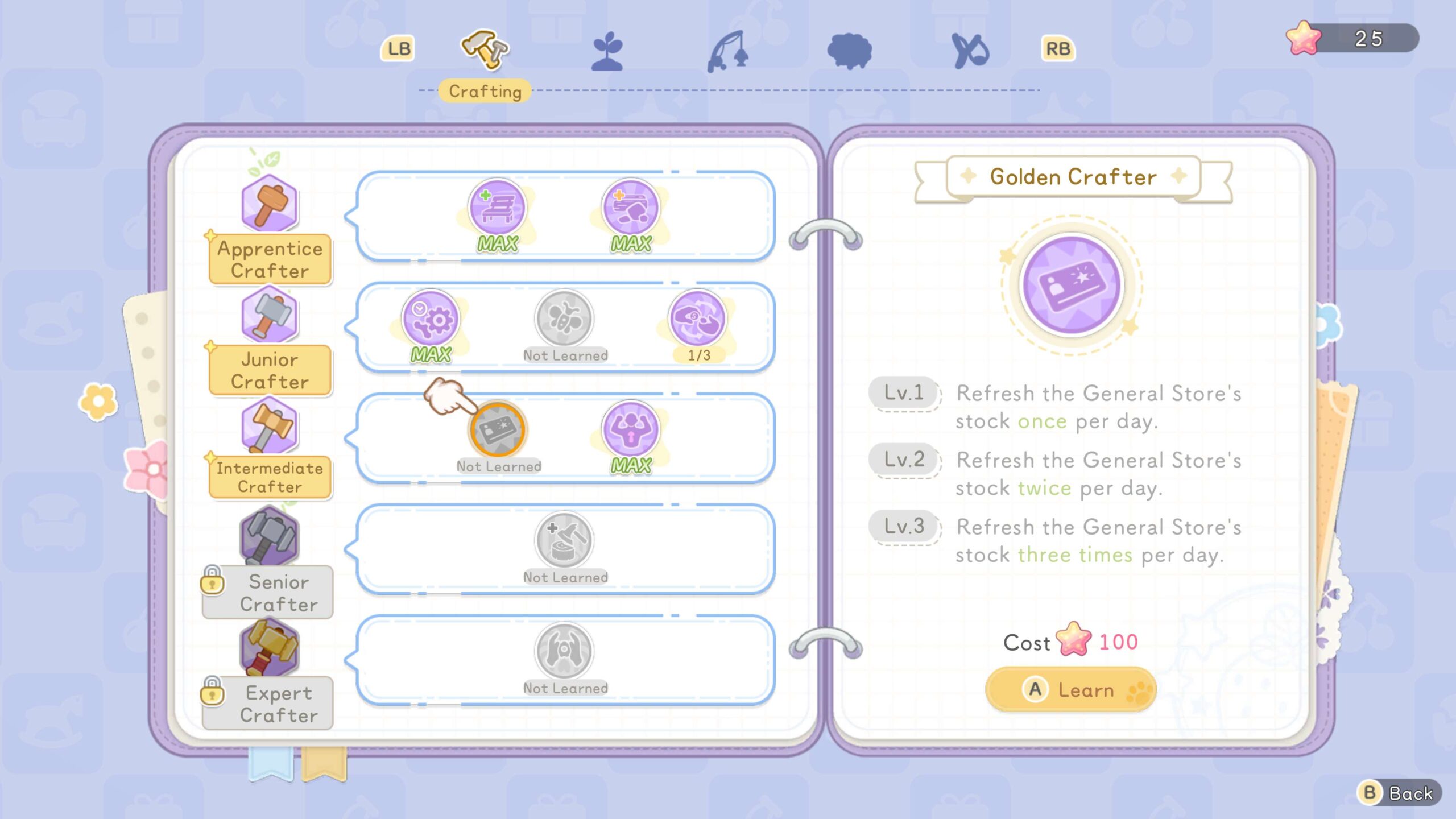Das Spiel bietet fünf Professionen: Crafting, Landwirtschaft, Angeln, Viehwirtschaft und Erkundung. Diese Professionen umfassen jeweils fünf Expertiselevel, vom blutigen Anfänger bis zum Experten. Der Fortschritt erfolgt über Aufgaben und Zertifizierungen, und man ist nicht auf eine Profession festgelegt, sondern kann mehrere Wege gleichzeitig einschlagen. Der Start im geerbten Haus ist bescheiden: erste Werkbänke platzieren, Weizen anbauen, Ressourcen sammeln. Doch schon bald erweitert man das Grundstück, kauft umliegendes Land und baut die eigene Basis Stück für Stück aus. Besonders angenehm ist, dass das Crafting nur wenige Sekunden dauert. Zwar ist die Herstellung mancher Gegenstände in mehrere Schritte unterteilt, aber minutenlange Wartezeiten bleiben zumeist aus. Saatgut benötigt länger, die Ernte lässt sich aber mit dem Einsatz von Dünger beschleunigen, sodass nie das Gefühl entsteht, künstlich stark ausgebremst zu werden.