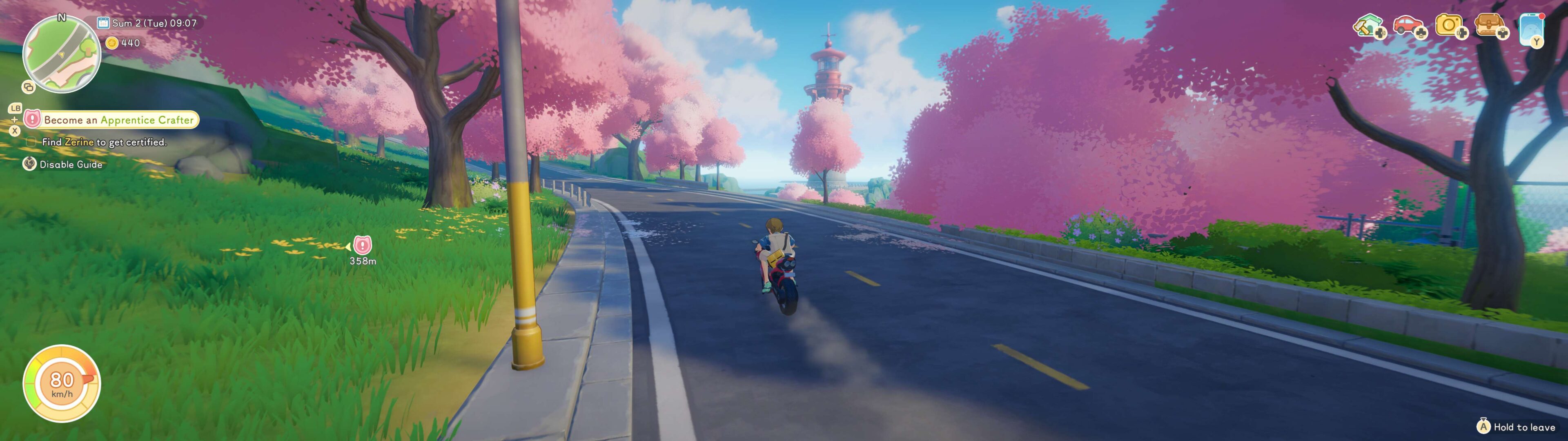 Um Aufgaben zu erfüllen, muss man häufig quer über die Insel reisen. Dazu sind wir glücklicherweise nicht nur zu Fuß unterwegs. Das Fortbewegungssystem ist umfangreich und reicht von craftbaren Hilfsmitteln wie einem Skateboard oder Rollschuhen über miet- und kaufbare Fahrzeuge wie Mopeds und Autos bis hin zu reitbaren Tieren und gar Wasserfahrzeugen wie Flößen und Booten. Unterschiede ergeben sich in der Geschwindigkeit und Flexibilität, sodass man je nach Situation das richtige Transportmittel wählen sollte, um von A nach B zu kommen. Die Navigation ist dank Questmarkern und interaktiver Karte einfach, aber die Wege bleiben lang. Erst später erleichtern ein portables Aufgabenbrett sowie ein Schnellverkaufssystem direkt in der eigenen Basis den Alltag. Mit Freischaltung der Blaupause für einen Teleporter werden weite Wege zudem in Sekundenschnelle überquert und auch Schnellreiseziele können gelegt werden. Bevor man diese hilfreichen Tools erhält, muss man allerdings fortgeschrittene Professions-Ränge erreichen, was viele Stunden dauert.