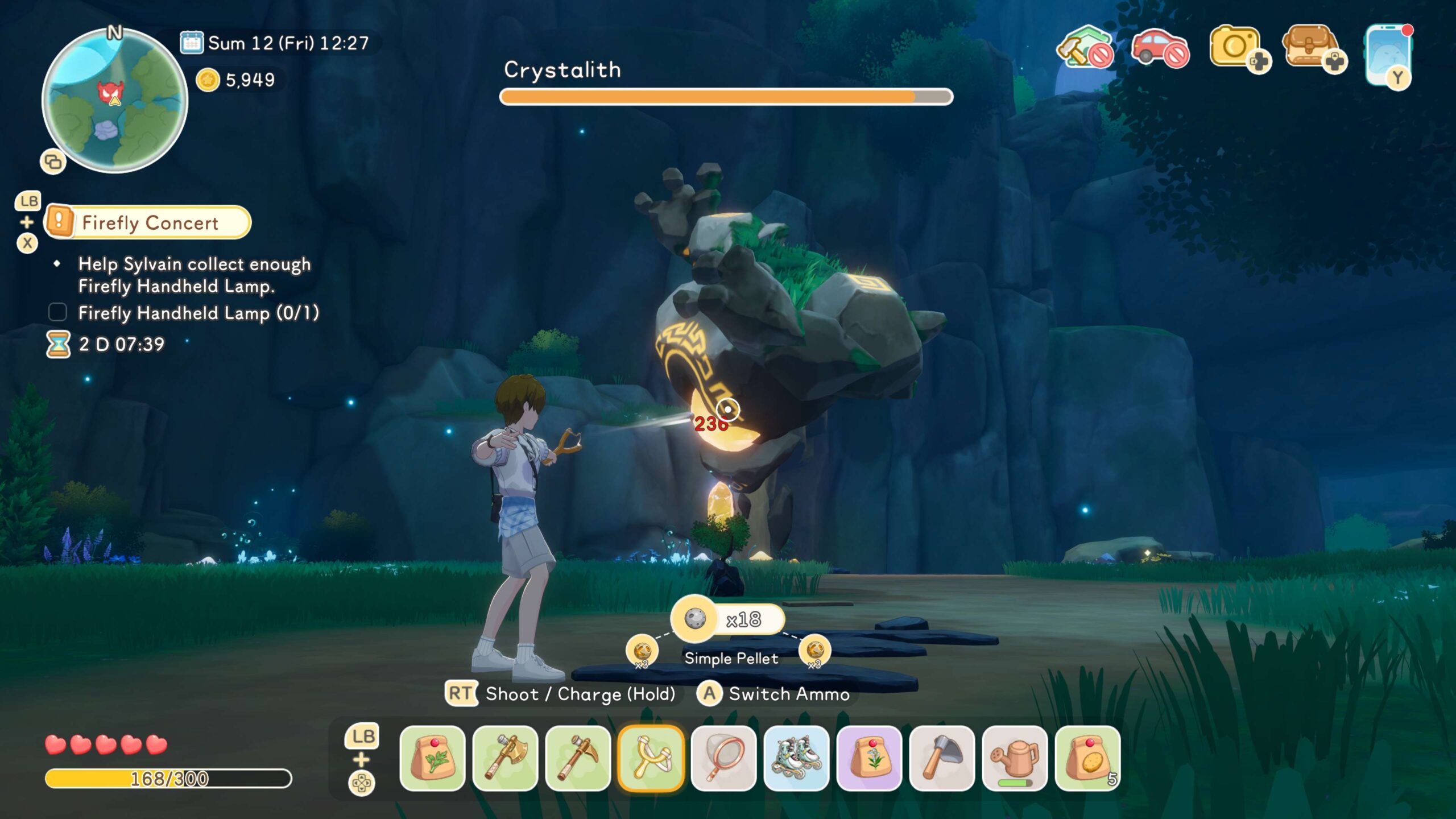 Der Rucksack ist zu Beginn klein und schnell voll. Zwar kann man ihn erweitern und Aufbewahrungstruhen herstellen. Doch durch die Vielzahl an Ressourcen, Samen und Düngemitteln sowie Lebensmitteln ist ein häufiges Inventarmanagement unvermeidlich. Erst später sorgen große Stauboxen und der Remote-Zugriff auf diese für Entspannung. Doch wie auch bei den Hilfsmitteln zur Fortbewegung müssen Spieler und Spielerinnen gehörig Zeit in das Spiel investieren, bis diese Tools verfügbar werden. Bis dahin ist das ständige Sortieren und Ausmisten eher lästig und bremst den Spielfluss gelegentlich aus.
