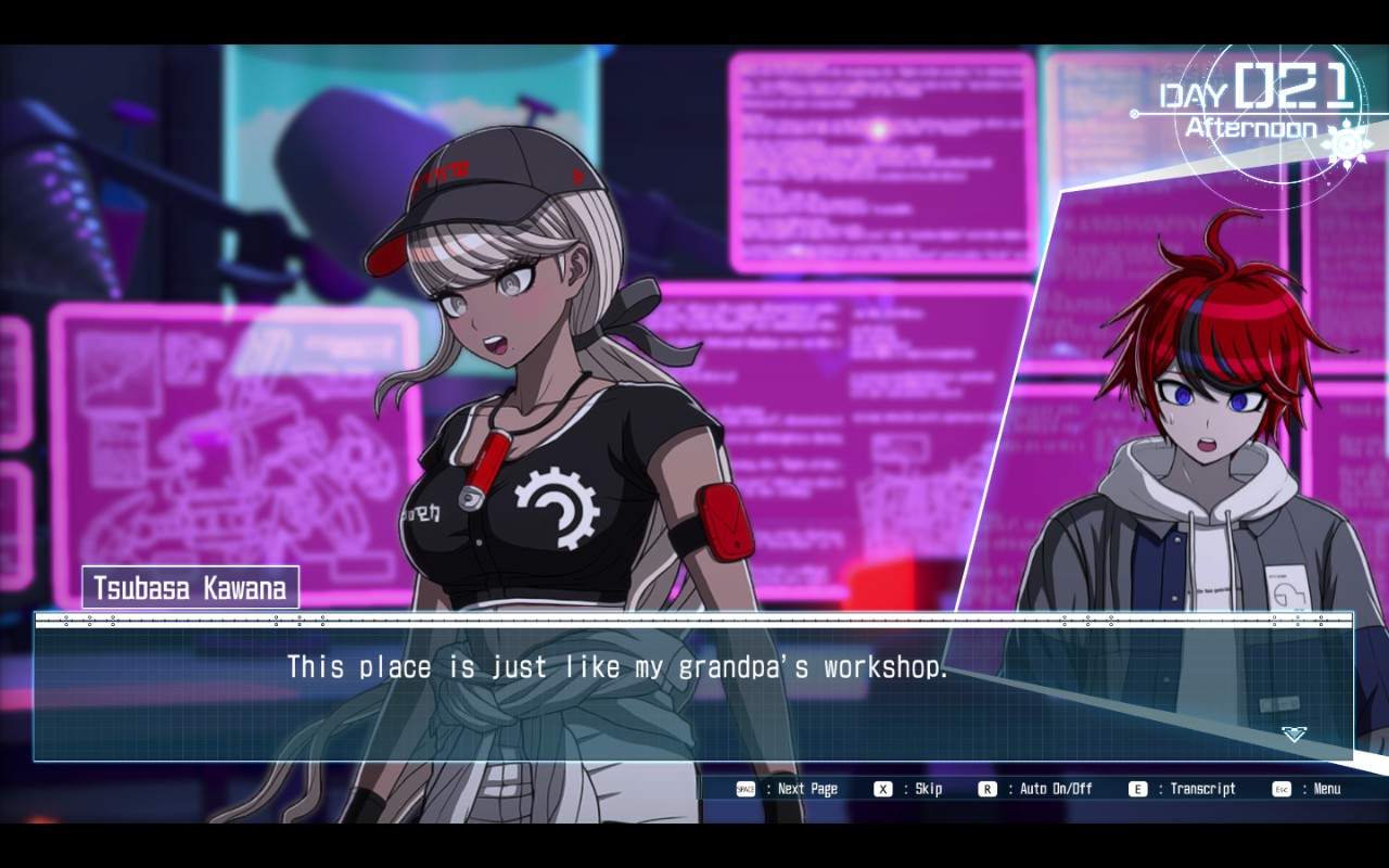 Im Laufe der 100 Tage werden zusätzliche Räume in der Schule freigeschaltet, die weitere Tätigkeiten ermöglichen. So kommt beispielsweise mit dem “Gift-O-Matic” eine weitere Option hinzu, Punkte für den Notenaufstieg in verschiedenen Kategorien zu verdienen und so neue Upgrades freizuschalten. Im Gespräch mit den Figuren erfahren wir beiläufig, welche Werte diesen wichtig sind und welche Dinge ihnen vor dem Ausbruch der chaotischen Situation Freude bereitet haben. Diese Hinweise nutzen Spieler, um mit dem Gift-O-Matic Geschenke zugeschnitten auf die Charaktere herzustellen und zu verteilen. Weiterhin wird ein „Bond“-System freigeschaltet, das ermöglicht, mit passenden Geschenken die Zuneigung der Charaktere für Protagonist Takumi zu erhöhen. Für die Herstellung von Geschenken werden abermals Ressourcen aus der Erkundung benötigt. Dadurch ergibt sich ein schöner Spielfluss, der Konversationen mit den Figuren, Trainingseinheiten in der VR Station und Erkundungstouren sehr angenehm miteinander verzahnt. Das Spiel gab mir zu keiner Sekunde den Eindruck, dass ich bestimmte Tätigkeiten priorisiert ausüben musste, sondern überließ mir sehr frei die Entscheidung darüber, welche Upgrades ich mit welchen Aktivitäten anstreben würde.